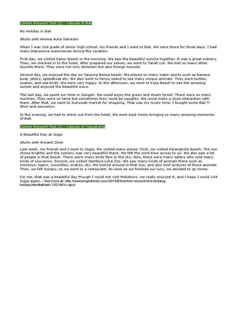 Contoh recount text tentang liburan Contoh 2 Holiday in jogja I spent a week in Jogja with my parent in my grantparent house. Contoh Recount Text 1 - Liburan di Bali. We were there for four days.